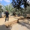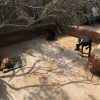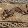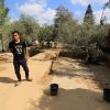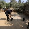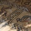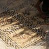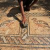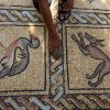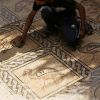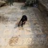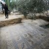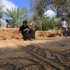 فلسطينيون ينظفون أرضية فسيفساء تعود إلى الحقبة البيزنطية ، اكتشفها مزارع في البريج وسط قطاع غزة