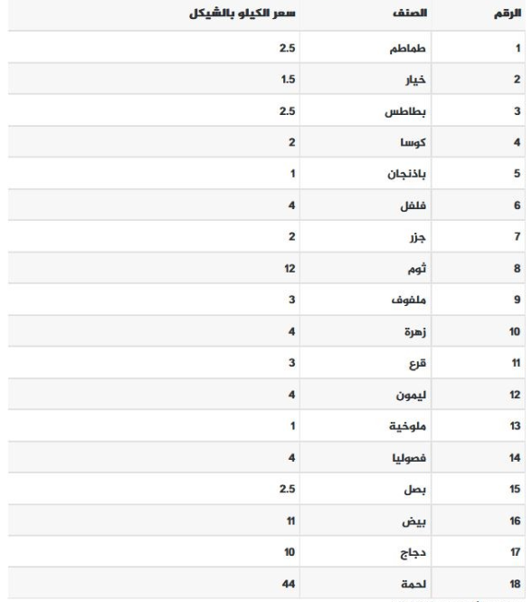 نشرت وزارة الزراعة بغزة، متوسط أسعار المنتجات الزراعية (الخضروات واللحوم) في الأسوق المحلية، منوهًة إلى أنها يجب ألا تزيد عن الأسعار المدونة أدناه للمستهلك.