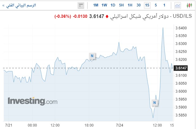 وقالت وسائل إعلام "اسرائيلية" إن قيمة الشيكل مقابل الدولار الأميركي انخفضت، بعد تداول العملة الأميركية في وقت سابق اليوم بقيمة 3.58 شيكل، سجل الدولار زيادة حادة بعد تصريحات "لبيد" بلغت في ذروتها 3.645 شيكل، قبل أن يتراجع إلى 3.6159 شيكل للدولار الواحد.