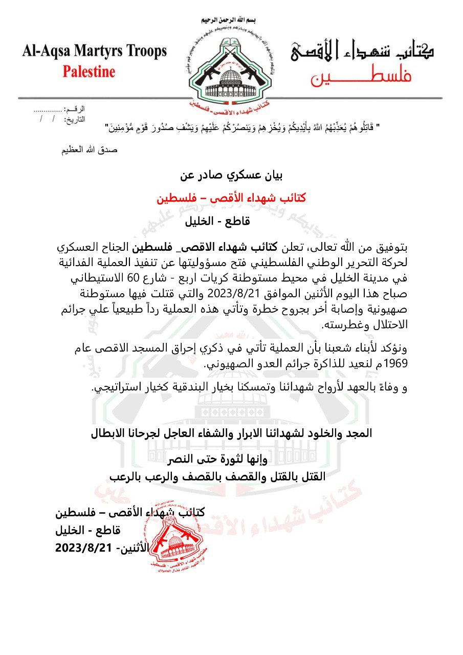 أعلنت كتائب شهداء الأقصى، مسؤوليتها عن تنفيذ العملية الفدائية في مدينة الخليل في محيط مستوطنة كريات أربع، والتي قتلت فيها مستوطنة، وإصابة آخر بجروح خطيرة.