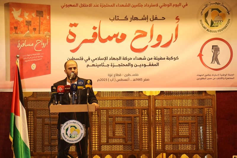 جاء ذلك، في حفل إشهار كتاب (أرواح مسافرة- كوكبة مضيئة من شهداء حركة الجهاد الإسلامي في فلسطين، والمفقودين والمحتجزة جثامينهم) نظمته مؤسسة مهجة القدس للشهداء والأسرى والجرحى، في مدينة غزة، بحضور قادة من فصائل فلسطينية وكوادر من حركة الجهاد، وأفراد من ذوي الشهداء.